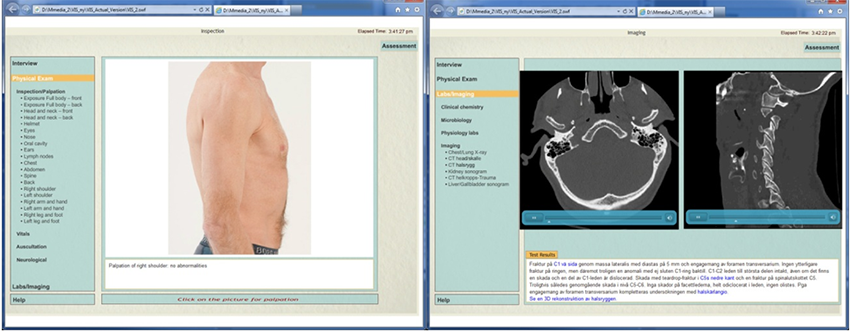 Figur 1. Utdrag från VIS-Ed där användaren kan intervjua en virtuell patitent och beställa undersökningar såsom CT-undersökning.
