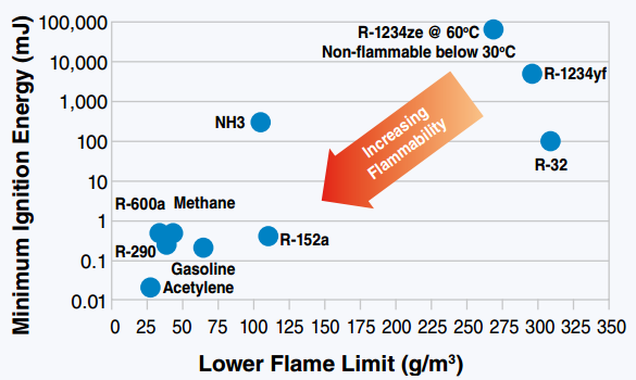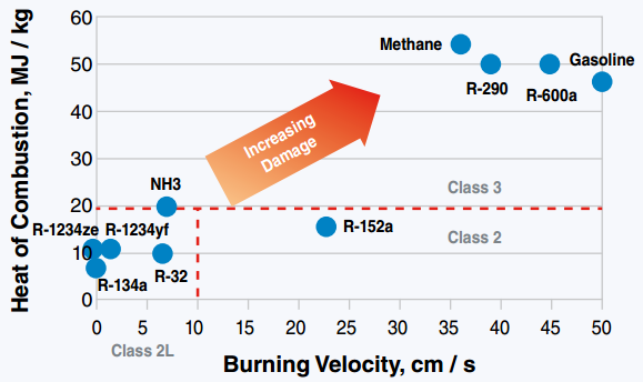 Som framgick av Fig. 3 anses ett köldmedium ”lätt brandfarligt” och klassificeras i A2L om det brinner med en hastighet som inte är större än 10 cm/s. Kolväten brinner däremot flera gånger snabbare.
