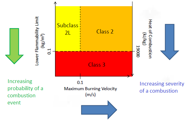 I standarder delas köldmedierna in i olika brännbarhetsklasser och beroende på klassificeringen finns olika regler för användningen. Internationellt används ofta ASHRAE standard 34 “Designation and Safety Classification of Refrigerants” som klassificerar köldmedier baserat både på deras toxicitet och deras brandfarlighet. Enligt standarden klassificeras köldmedier från icke brandfarliga, klass A1, till mycket brandfarliga, A3, beroende på LFL värde, förbränningsvärme och den maximala förbränningshastigheten (Figur 3). Det kan noteras att underklassen 2L har införts nyligen för att särskilja några av de nya köldmedierna med låg GWP men viss brännbarhet från andra medier med något högre brännbarhet.