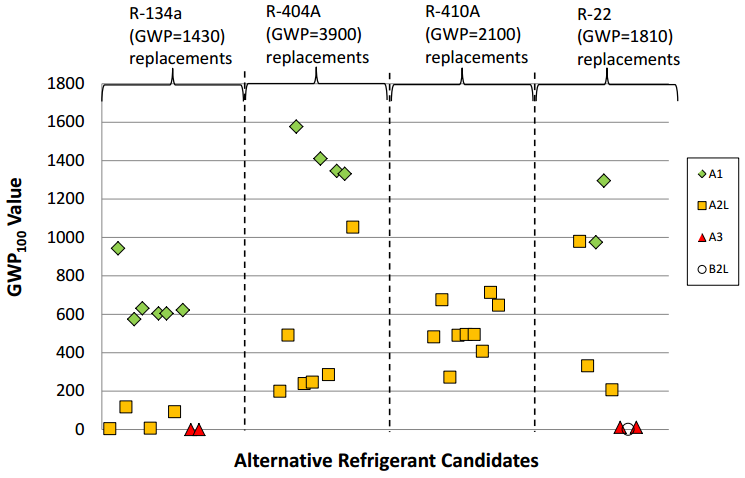 Med tanke på att många låg-GWP köldmedier är brännbara, är det mycket sannolikt att vi kommer att se utveckling av nya produkter som är anpassade för brännbara medier. Av säkerhetsskäl är det möjligt att köldmedier i klass A2L i första hand kommer att användas.