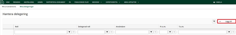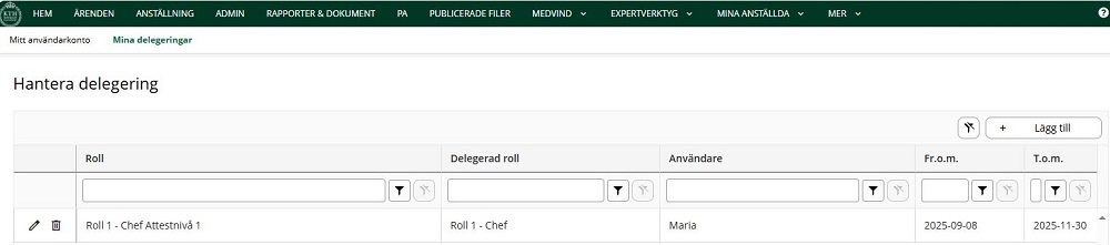 2. Här kan du se dina delegeringar. Delegeringen innebär att du ger din rolls rättigheter till en annan användare. Delegeringen är datumstyrd och du kan ge rättigheter till alla eller enstaka rapporteringsställen. För att delegera klicka på “+ lägg till”