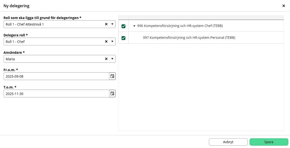 Användare – Här visas en lista på vilka man kan delegera rollen till, kryssa i berörd person