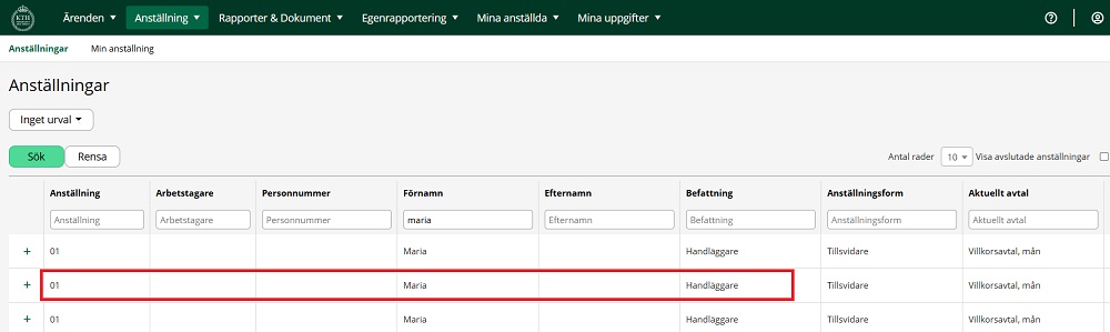 2. Se till att du är i fliken “Anställningar” och sök upp den anställde