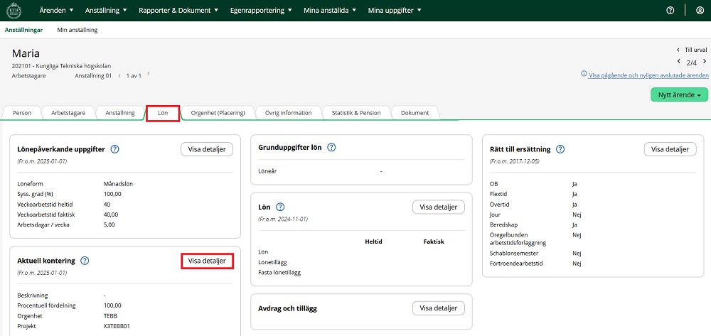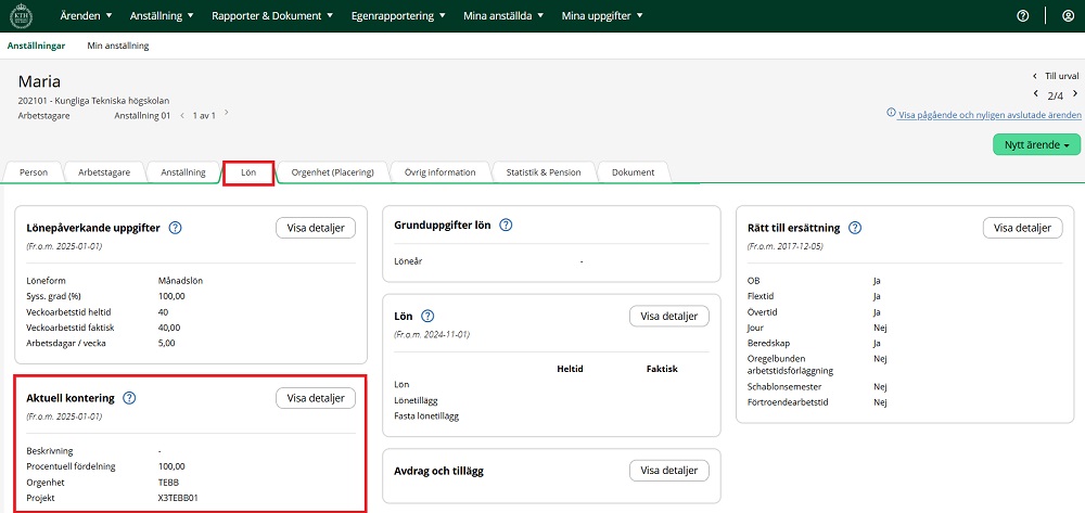 Om personen har delad kontering syns bara ena konteringen i vyn under lön, men om du klickar på “Visa detaljer” ser du hur konteringen är fördelad. Ex 2: