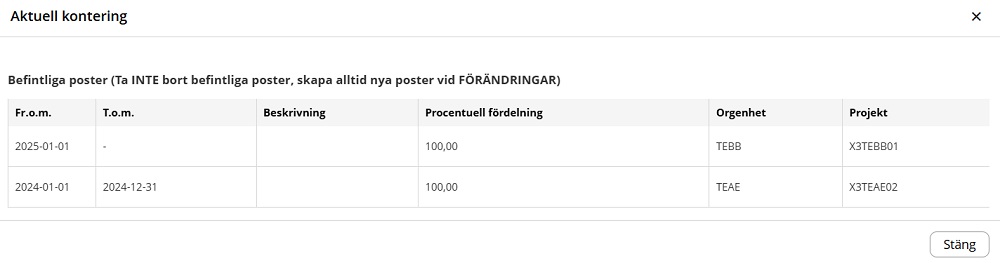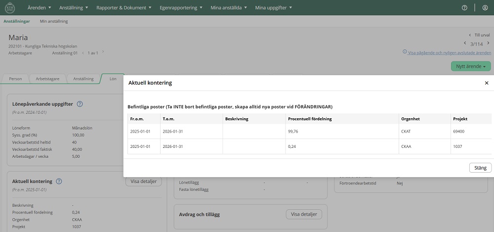6. Där kan du se historiska poster om personen har bytt konteringsställe eller se om personen har konteringen på flera olika Orgenheter och/eller projekt. Ex 1: