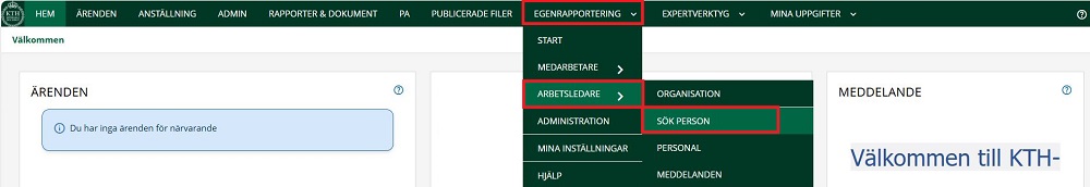 1. Klicka på "Egenrapportering", “Arbetsledare” och “Sök person”.