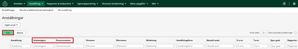 2. Sök upp personen via arbetstagarid/personnummer och klicka på “Sök” eller enter.