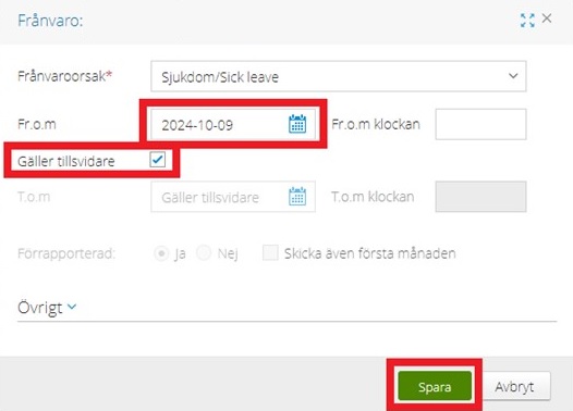 5. Välj frånvaroorsak ”Sjukdom” och lägg in Fr.o.m datum. Om du inte vet när du kommer tillbaka, bocka i ”Gäller tillsvidare”. Om du vet när du väntas åter kan du fylla i T.o.m. Klicka sen på ”Spara”.