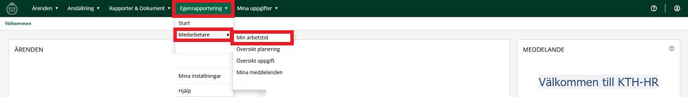 2. Håll muspekaren över "Egenrapportering", “Medarbetare” och klicka på “Min arbetstid”.