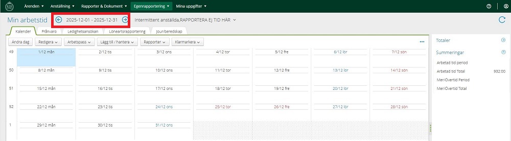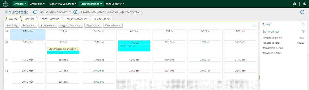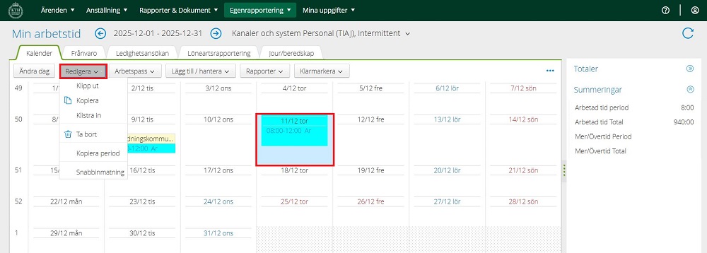 11. Du har nu registrerat dina arbetstimmar och kan nu lägga in flera dagar/tider. Se dock alltid till att du befinner dig i rätt planering. I fliken “Redigera” finns flera snabbkommandon, markera den dagen du vill redigera och välj det kommando som passar dig: