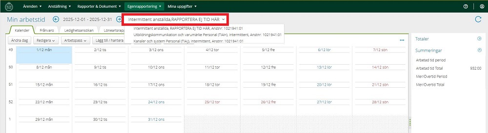 4. När du loggar in första gången så ligger du placerad i “Intermittent anställda”, i denna ska du INTE rapportera din tid. Du behöver klicka på texten så öppnas en rullgardinsmeny med de olika placeringarna som du har. Välj den placering som du ska registrera tiden på.