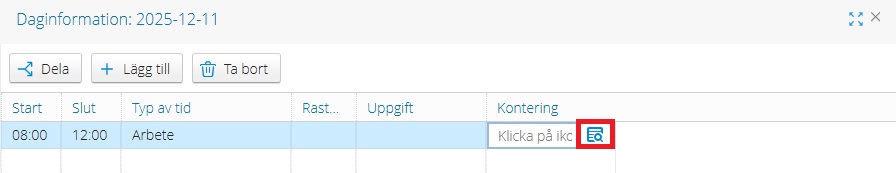 7. När du ska lägga in “Kontering” behöver du klicka en gång och sen ytterligare en gång på den lilla ikonen som dyker upp.