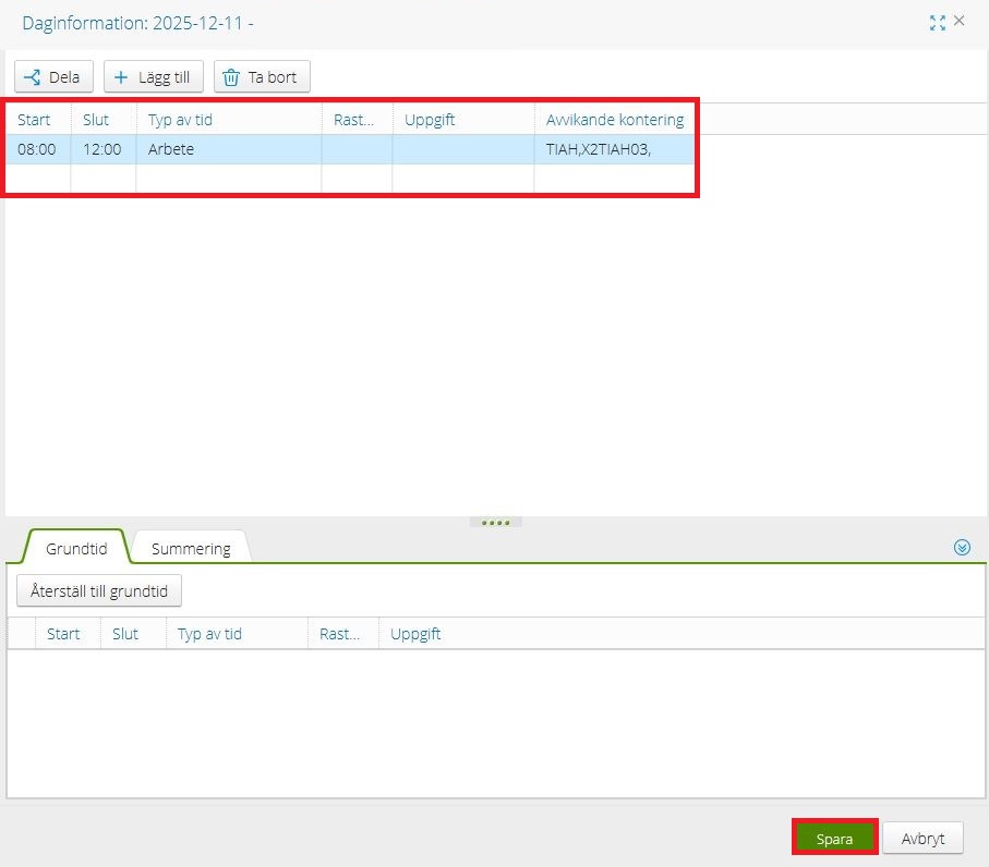 6. Du ska nu lägga in “Start”, “Slut”, “Typ av tid” (eventuell rast) och “Kontering”