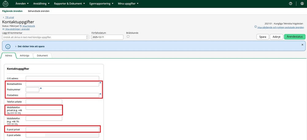 3. Fyll i dina kontaktuppgifter: Adress, postnummer och postadress. Det är även bra att fylla i privat telefonnummer och epost.