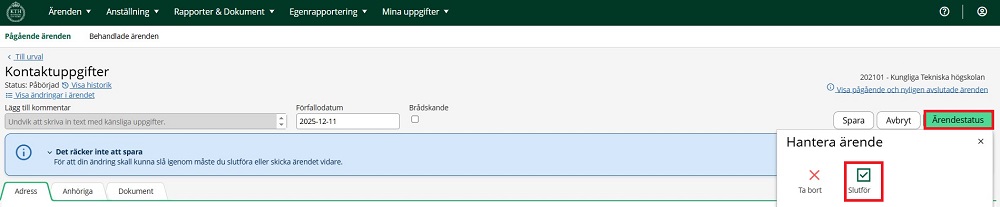 4. Klicka på "Ärendestatus” följt av “Slutför” för att uppdateringen ska gå igenom.