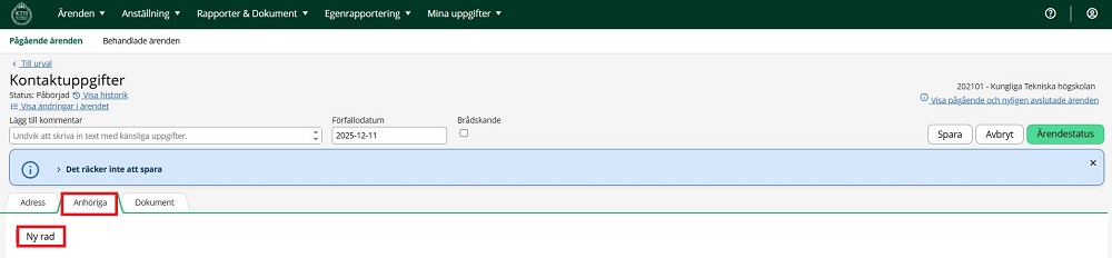 1. Gå in på fliken "Anhöriga" och välj "Ny rad".