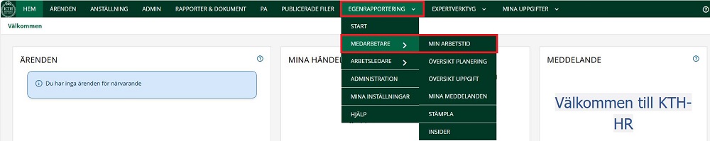 1. Klicka på "Egenrapportering", ”Medarbetare” och "Min arbetstid".