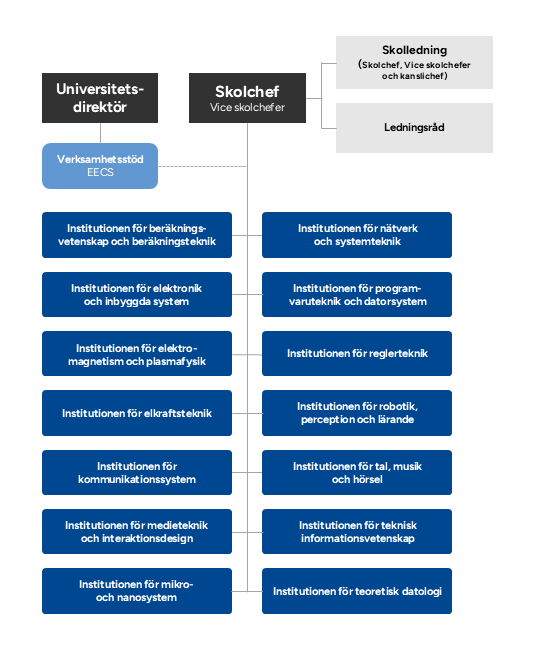 Skolan för elektroteknik och datavetenskap (EECS) består av fjorton institutioner, samt av forskningsinfrastrukturer och Verksamhetsstödets administrativa enheter. EECS har ungefär 1000 anställda.