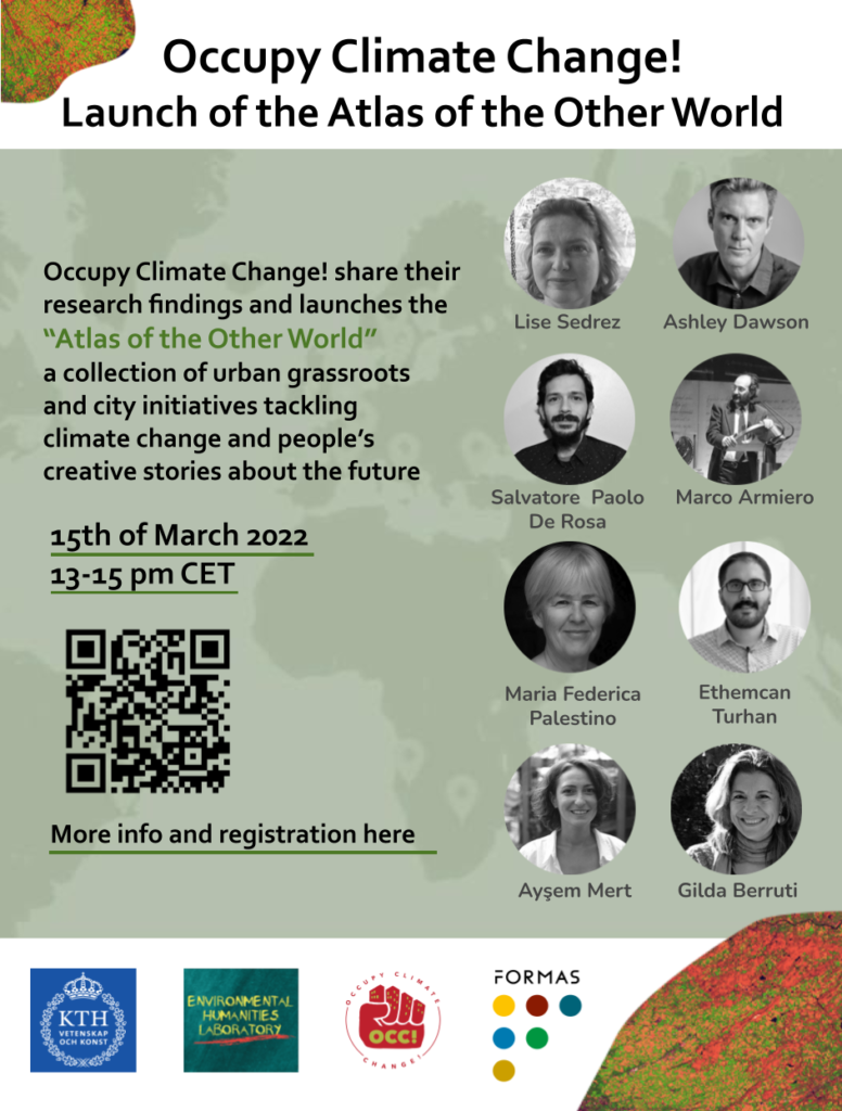 The Occupy Climate Change! research project has since its start in 2018 addressed and focused on practices and experiments of grassroots organizations and initiatives globally, investigating their diverse, dynamic, and self-organized responses to loss and damage caused by climate change. Join us when OCC! team presents their findings from case studies from New York, Malmö, Rio de Janeiro, Naples, and Istanbul and their launch of the “Atlas of the Other World”.