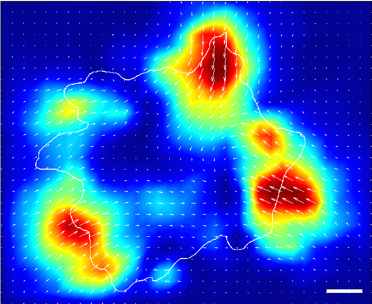 Force displacement fields of a human cell with induced actin ruffles around the cell periphery. The thin white lines indicate cell borders and the white arrows the directions and magnitude of the traction forces exterted by the cell. The red (blue) areas indicate high (low) traction forces. Scale bar; 10 µm.