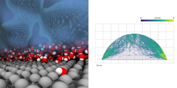 This project studies molecular processes in dynamic wetting, including how they affect larger scales and interface with continuum models. Although wetting is a phenomenon that can be observed by eye at the macroscale, processes at the molecular scale can play an important role, especially at the three-phase contact line, where solid, liquis and gas meet. Here displacements of small groups of molecules determine how fast the contact line, and thereby the wetting advances. Molecular dynamics is a powerful tool to study these processes. Information obtained at the molecular scale is then transfered to model at larger scale in a multi-scale modeling framework.