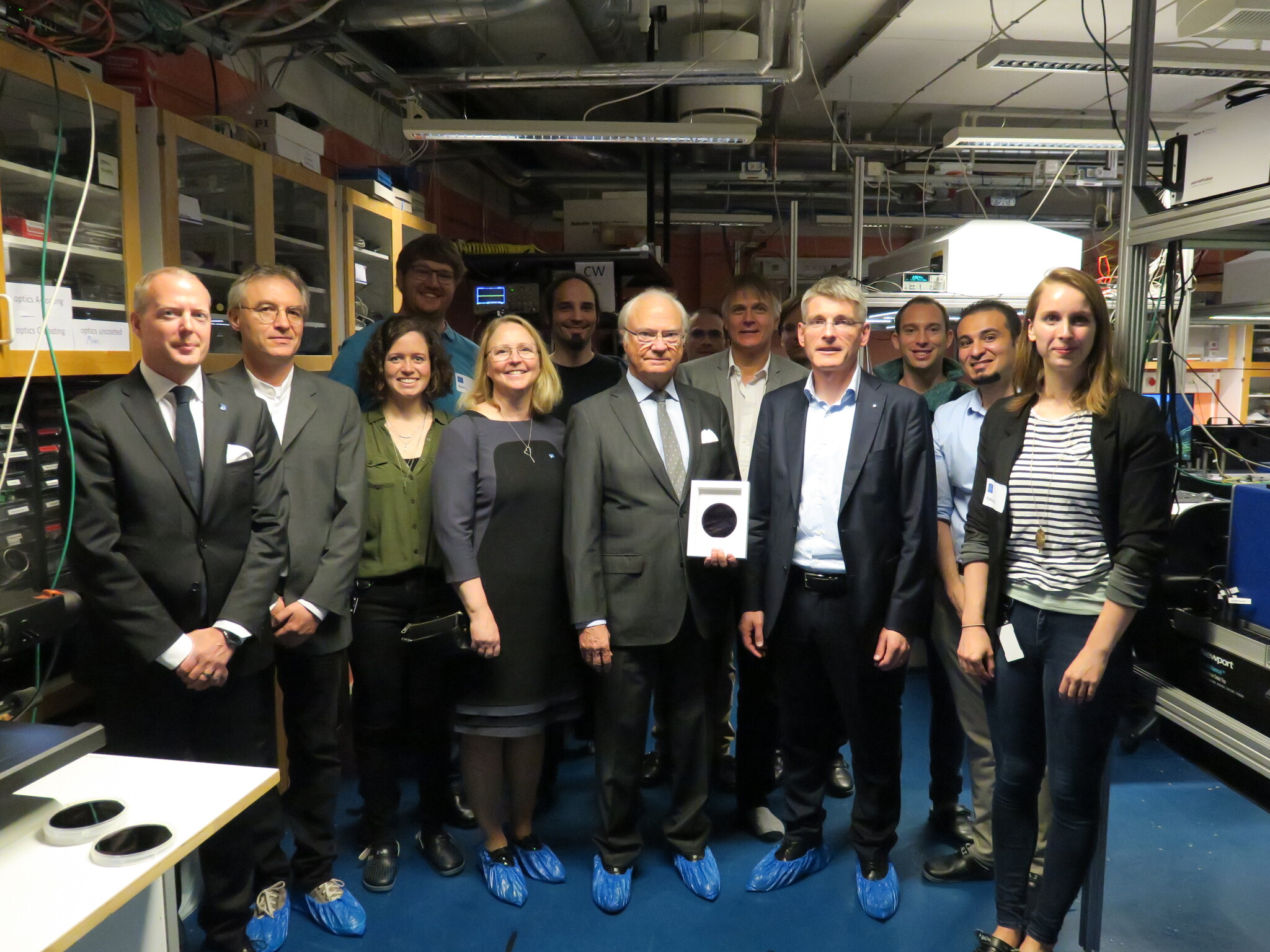 On May 15, the King visited KTH to get updated on the recent progress in Quantum Technology. First the King was given an introductory overview of the field by Prof. Gunnar Björk, followed by project presentations by KTH physics students Nicolas Reichel and Altai Dikme, and by Ph.D. students Katarina Zeuner, Julien Zichi, and Thomas Lettner. After the presentations the King was shown Prof. Valery Zwillers lab, where different experimental research projects in quantum communication were demonstrated. The visit terminated by the King opening the KTH-Ericsson quantum link, a “dark” optical fiber where single photons can be transmitted between the Albanova building and Ericsson Research at Kista. Present at the opening were also KTH was KTH’s vice rector for research, Annika Stansson Trigell, Ericsson’s CTO Erik Ekudden, and the Ericsson quantum research team at Kista joined the lab tour by direct video link.