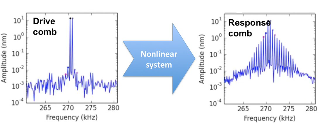 When driven with a frequency comb, the nonlinear system will respond with a new comb containing the intermodulation products of the drive tones.