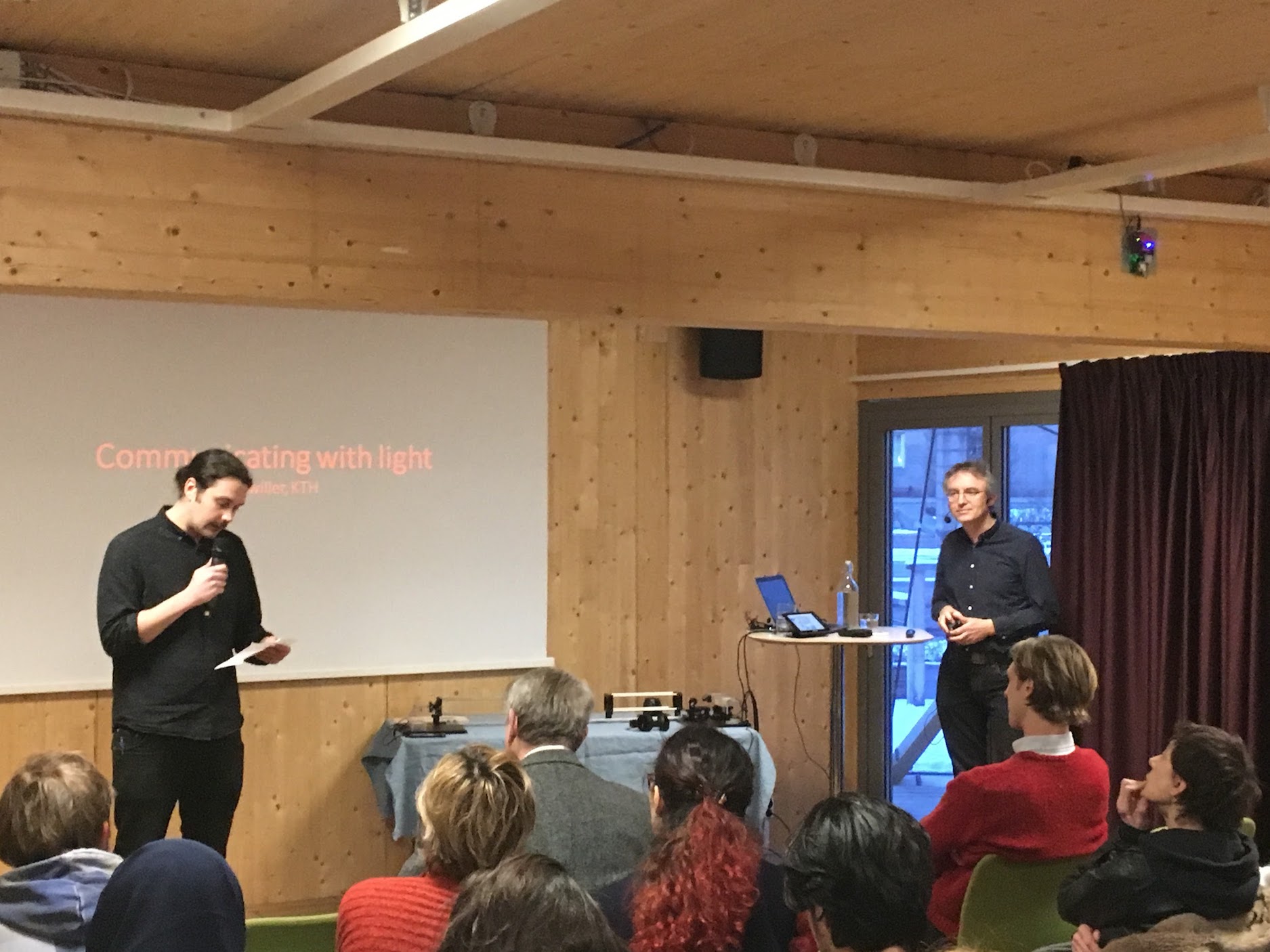Professor Val Zwiller contributed with a talk on the topic describing the history of communication with light and relating it to recent research efforts at KTH. PhD students Thomas Lettner, Lucas Schweickert, Katharina Zeuner and Julien Zichi were participating as well by providing and demonstrating an interactive exhibition that visitors could try out.