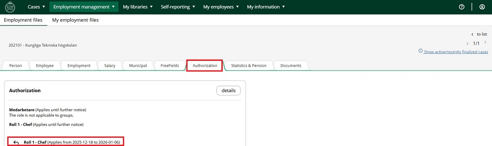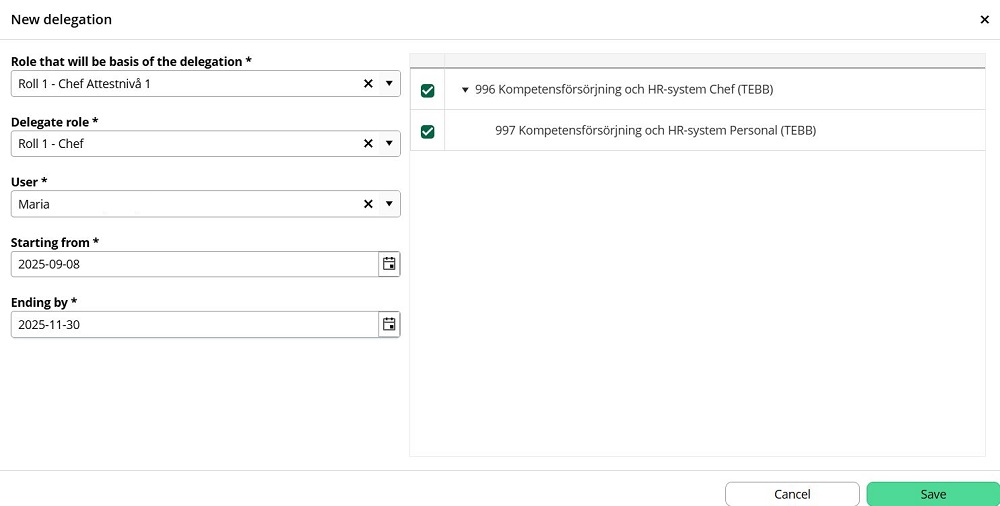You can delegate your role in KTH-HR if you are temporarily absent. You can control which role and organization the person should have access to, as well as the time period for the delegation. As a manager, you can delegate your role to another manager.