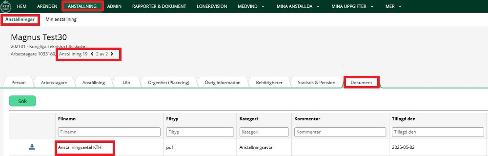 9. The employment will then be completed by salary, then you, as a manager, will find the contract in KTH HR. You’ll find it at “employment management”, “employment files” and look up the person. The contract will be under “document”, and don’t forget to choose the right employment.