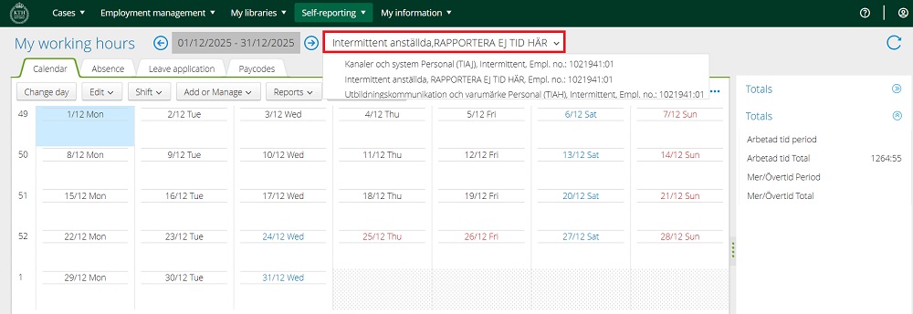 4. When you log in for the first time, you will be placed under "Intermittent anställda". You should NOT report your time here. Click on the text to open a dropdown menu with the different placements you have. Select the placement where you want to register your time
