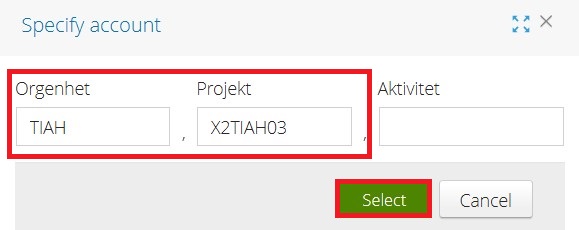 8. Fill in “Orgenhet” and “Project” with the information you received when you were booked. Then click “Select”