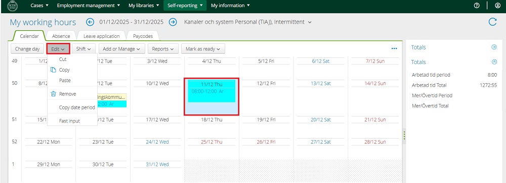 11. You have now registered your working hours and can add more days/times. Always make sure you are in the correct planning view. In the “Edit” tab, there are several shortcuts; select the day you want to edit and choose the appropriate command: