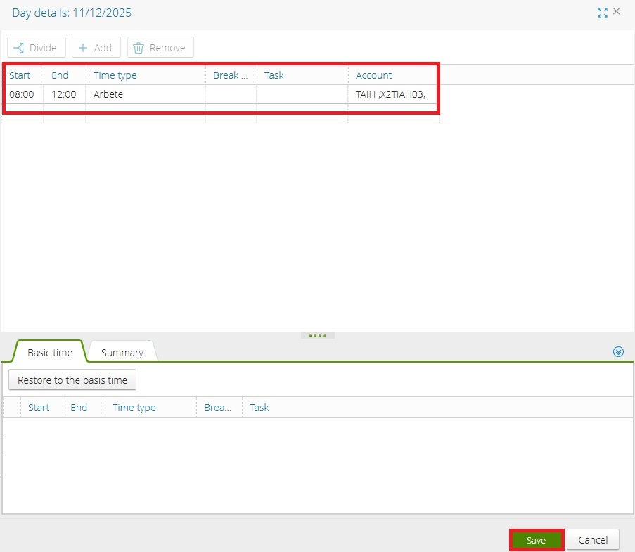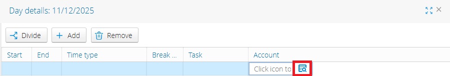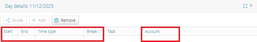 6. Now enter “Start”, “End”, “Time type” (and any breaks), and “Account”