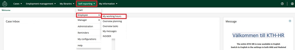 1. Hover your mouse over “Self-reporting”, “Employee”, and select “My working hours”