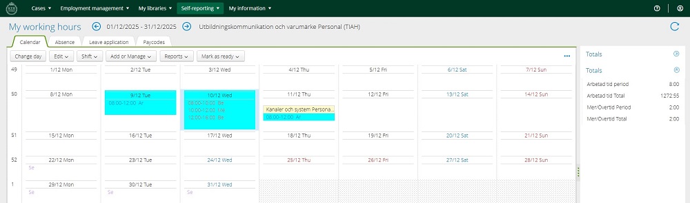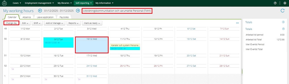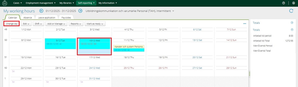 4. You will now see in the calendar that on-call duty has been registered. If you are required to report to the workplace, overtime compensation will apply. To register this in Self-reporting, you need to split the on-call duty. Double-click on the day you wish to split the on-call duty or select the day and click “Edit day”