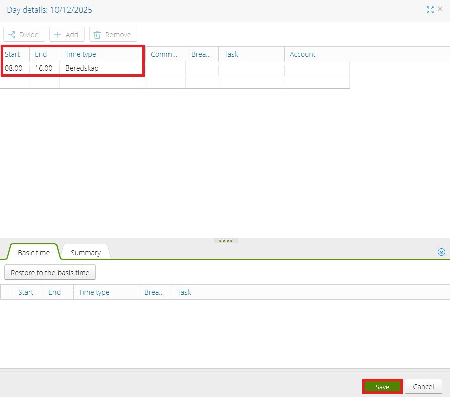 3. Enter “Start”, “End”, and select “Beredskap (On-call)” as the time type. Then click “Save”