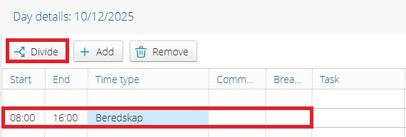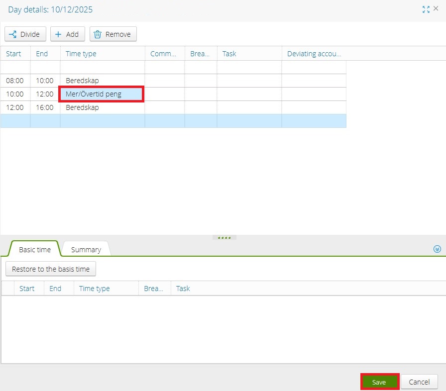7. You have now split the on-call duty into three parts. Select the row corresponding to the time you worked and change the type of time to “Mer/Övertid peng (Extra/Overtime pay)”, then click “Save”