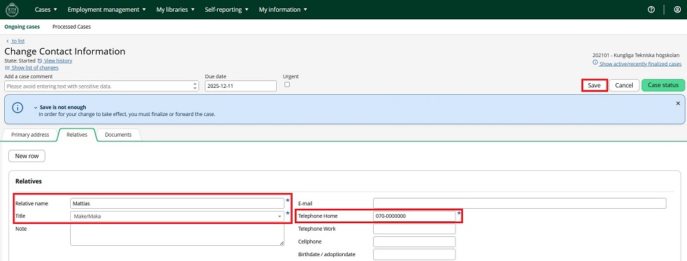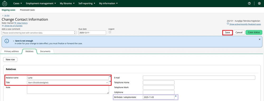 Choose your type of relation (“Title”) select "Barn (föräldraledighet)”