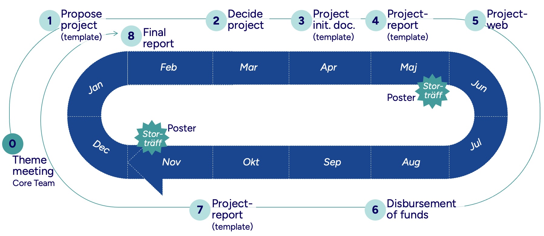 Projects that have been decided to be funded must first create a project initiation document and then report semi-annually according to the Future Education process (a simplified version is found in the year wheel above). Templates and deadlines are important so that the projects can be made visible at, for example, the Storträffen meetup.